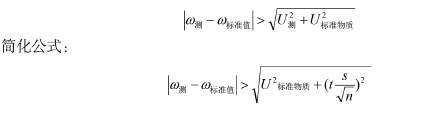如果實驗室對標準物質的測量值超出了標準物質特性量值的不確定度范圍,是不能直接 得出測量結果存在偏差的結論的,原因是標準物質的不確定度 U 標準物質僅包括了與標準物質定 值、均勻性、穩(wěn)定性有關的不確定度,沒有涉及用戶在實驗室里對標準物質進行測量有關的 隨機不確定度 U 測。因此,應采取以下通用公式判斷標準物質測量值與標準值之間存在顯著偏差: