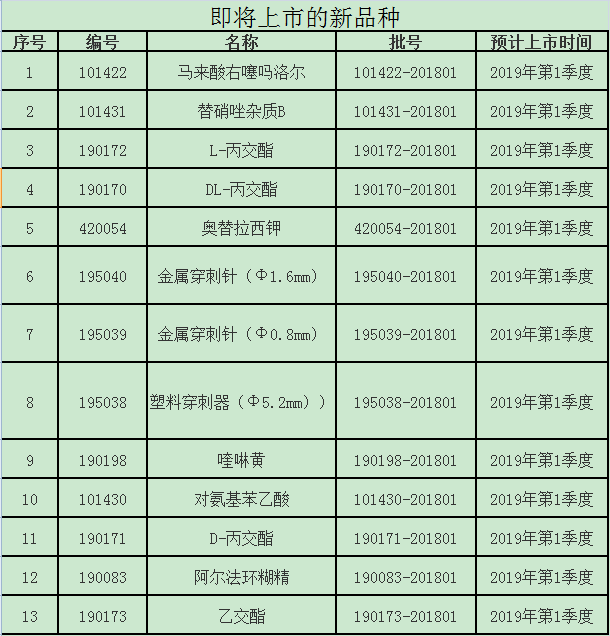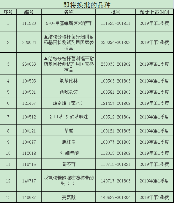 ? ? ? ? 2018年第十二期國家藥品標準物質供應新情況,包括13個即將上市的新品種,13個即將換批品種的預計上市時間、12個即將失效品種的有效使用期限和5個停用品種名單: