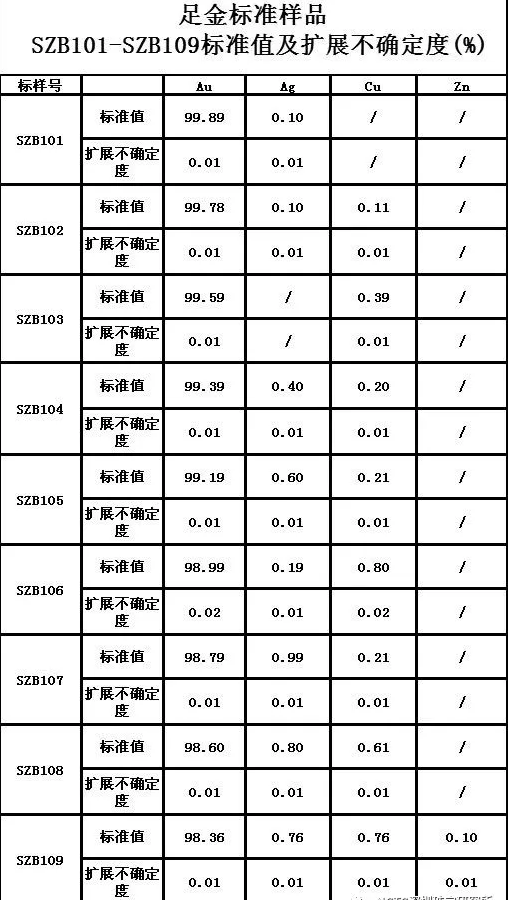 足金標(biāo)準(zhǔn)樣品的主要成分為金、銀、銅和鋅,金的質(zhì)量分?jǐn)?shù)梯度范圍為98.35%~99.90%的系列(九點)足金標(biāo)準(zhǔn)樣品,具有兩種規(guī)格:Φ15 mm×0.2 mm的圓片;? 15 mm×9 mm×0.2 mm的橢圓片。